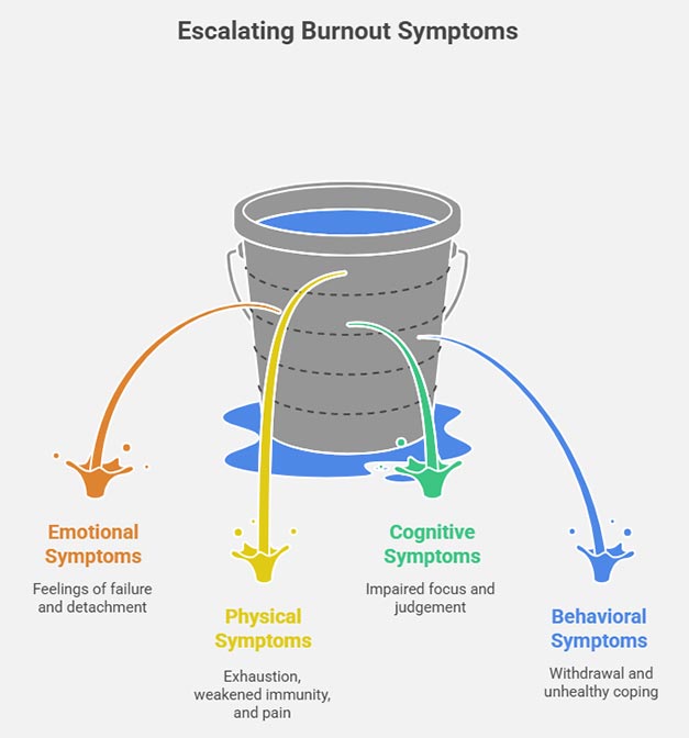 Physical wellness is impacted by burnout due to the excessive stress in your body. Your physical wellbeing can be impacted contributing to an increased likelihood for heart disease, high blood pressure, type 2 diabetes, respiratory issues, and likelihood for death before age 45.